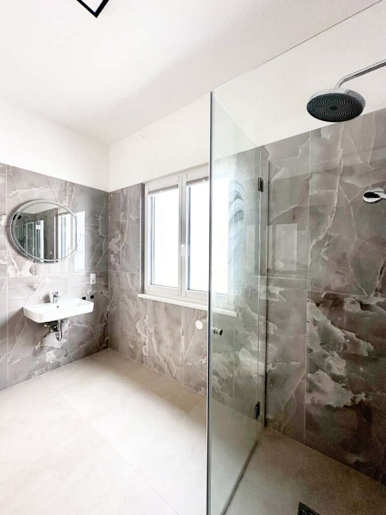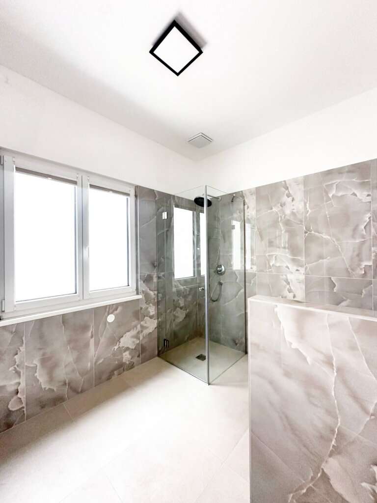 modernes Badezimmer mit Dusche, ein separates WC, einen Technikraum sowie